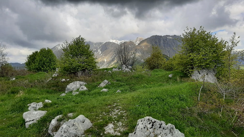 Z vrha, na katerem stoji križ in ob katerem se nahaja vpisna skrinjica, se nam odpre lep razgled na Krnsko skupino, vrhove nad dolino reke Tolminke, Cerkljansko in Idrijsko hribovje, Trnovski gozd, del doline reke Soče ter Kolovrat in Matajur.