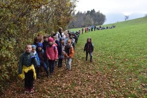 Zjutraj sta dva avtobusa vseh 80 pohodnikov odpeljala proti mestu Vransko, kjer smo pričeli naš izlet. Pot se je ves čas rahlo vzpenjala, ponekod tudi strmeje, ko smo v gozdu prečili hudourniško grapo. Na vrhu je bil odprt planinski dom, kjer smo imeli dolg postanek. Učenci so se sladkali s palačinkami in zavihki različnih okusov. Pred domom so se učenci igrali na travniku, se lovili in kotalili po jesenskem listju. Sestopili smo po isti poti.