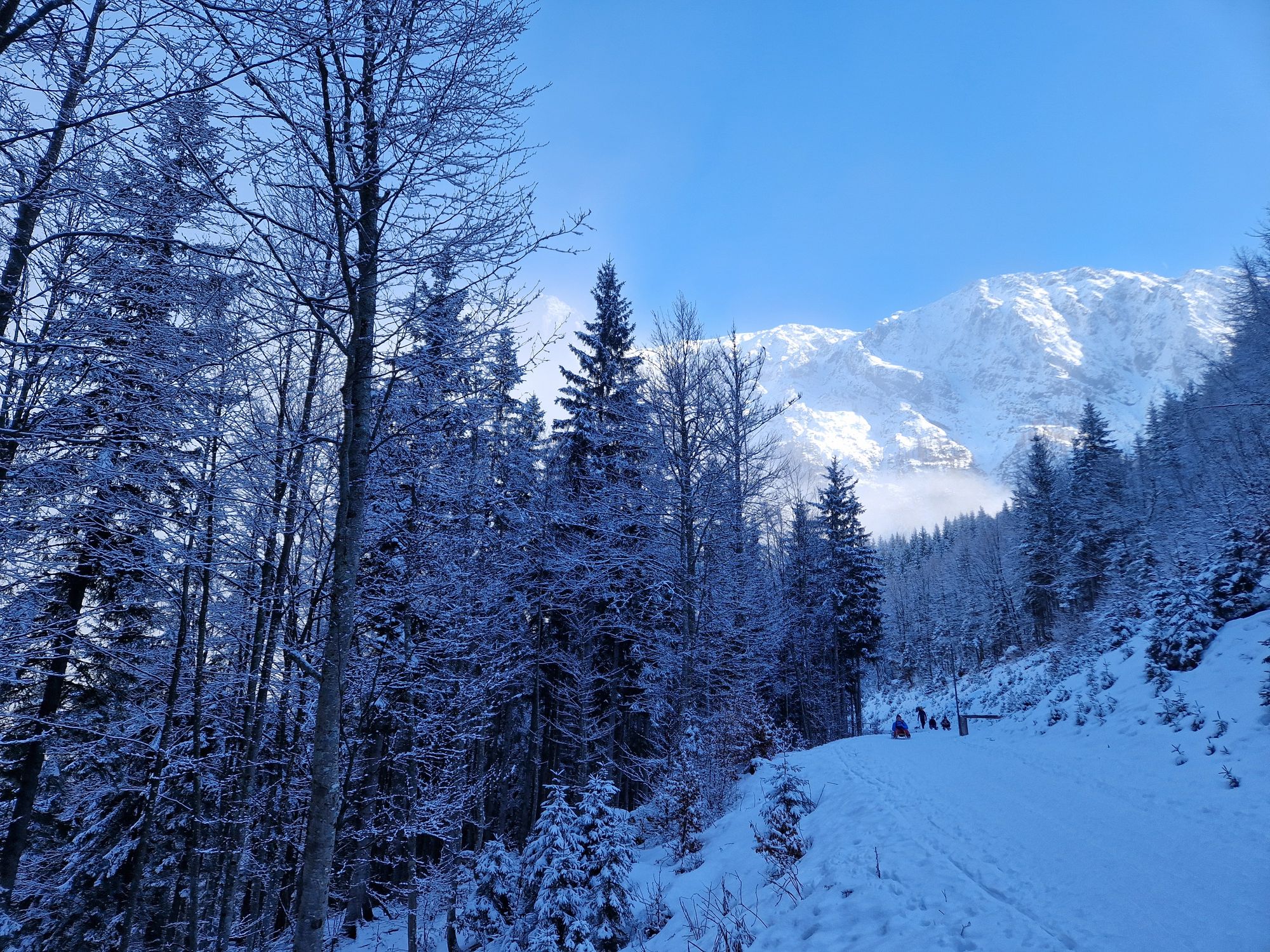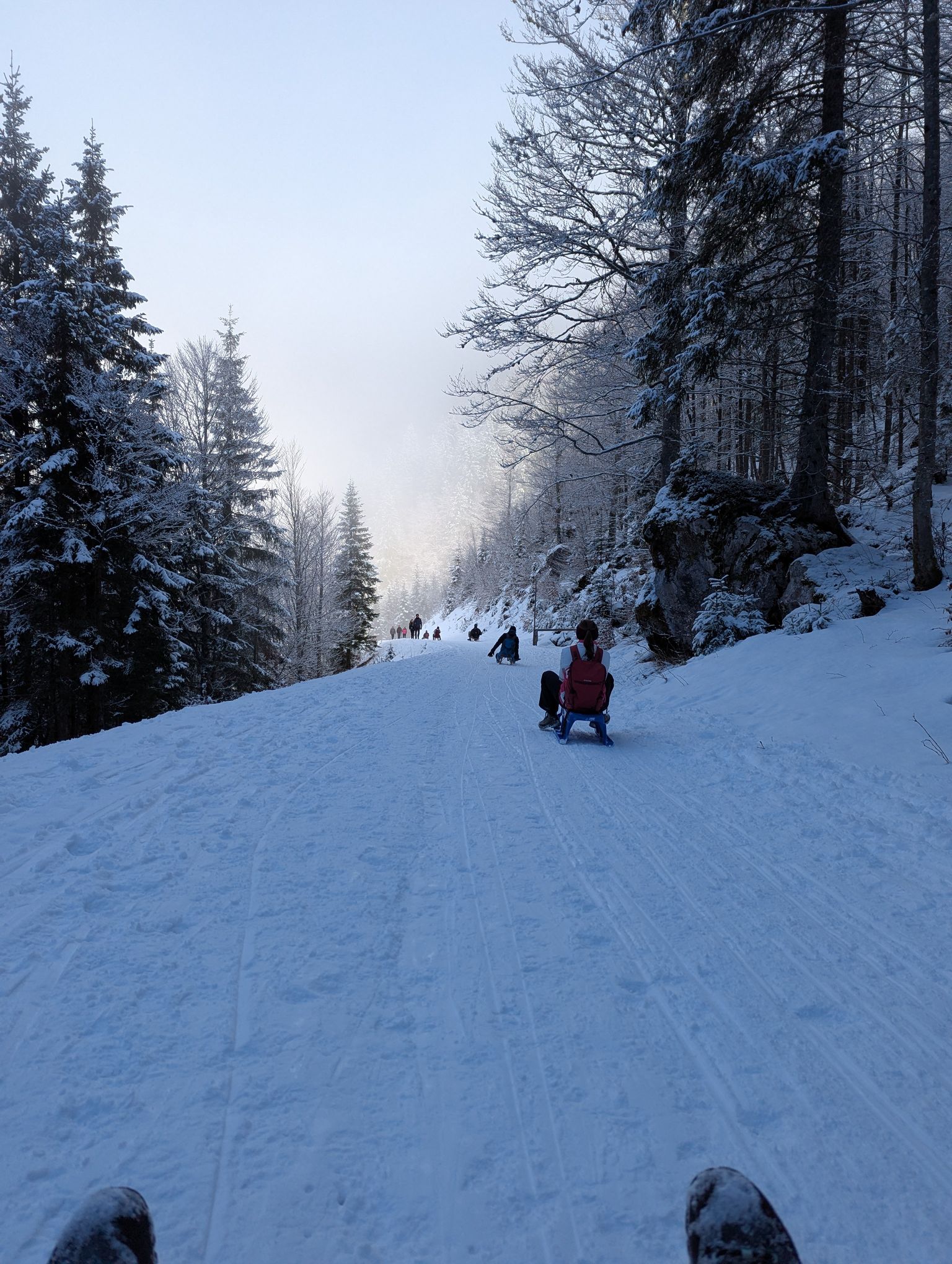 Iz Tivolija smo se zapeljali do zgornjega Belopeškega jezera, ob katerem je večje parkirišče. Vsak s svojimi sankami smo se podali po širokem kolovozu proti koči Zacchi. Na spodnjem delu poti je bila plast snega dokaj tanka, a vseeno popolnoma dovolj debela za sankanje. Kmalu smo prešli snežno mejo preteklega tedna, zato se je na drevju in poti pojavil sveže zapadel sneg. Bilo ga je ravno prav, da je bila hoja prijetna in ni prav nič drselo. Na zgornji polovici poti je skozi meglo že počasi prodiralo sonce. H koči smo tako po 1h 45 min hoje prišli v soncu in s čudovitim razgledom na okoliške vrhove. V krogu smo se usedli na sanke in pomalicali ob prijetnem gretju sončnih žarkov. Nato je sledil spust s sankami. Razmere so bile odlične, saj je bilo na stari snežni podlagi ravno prav novega mehkega snega.